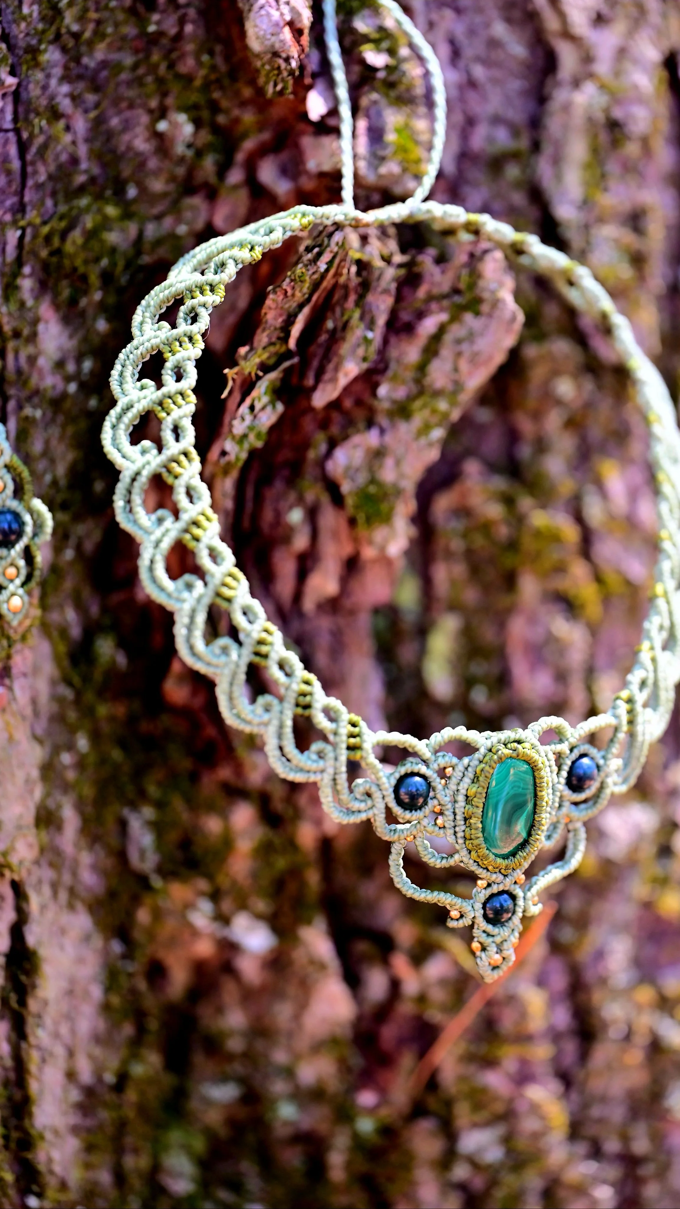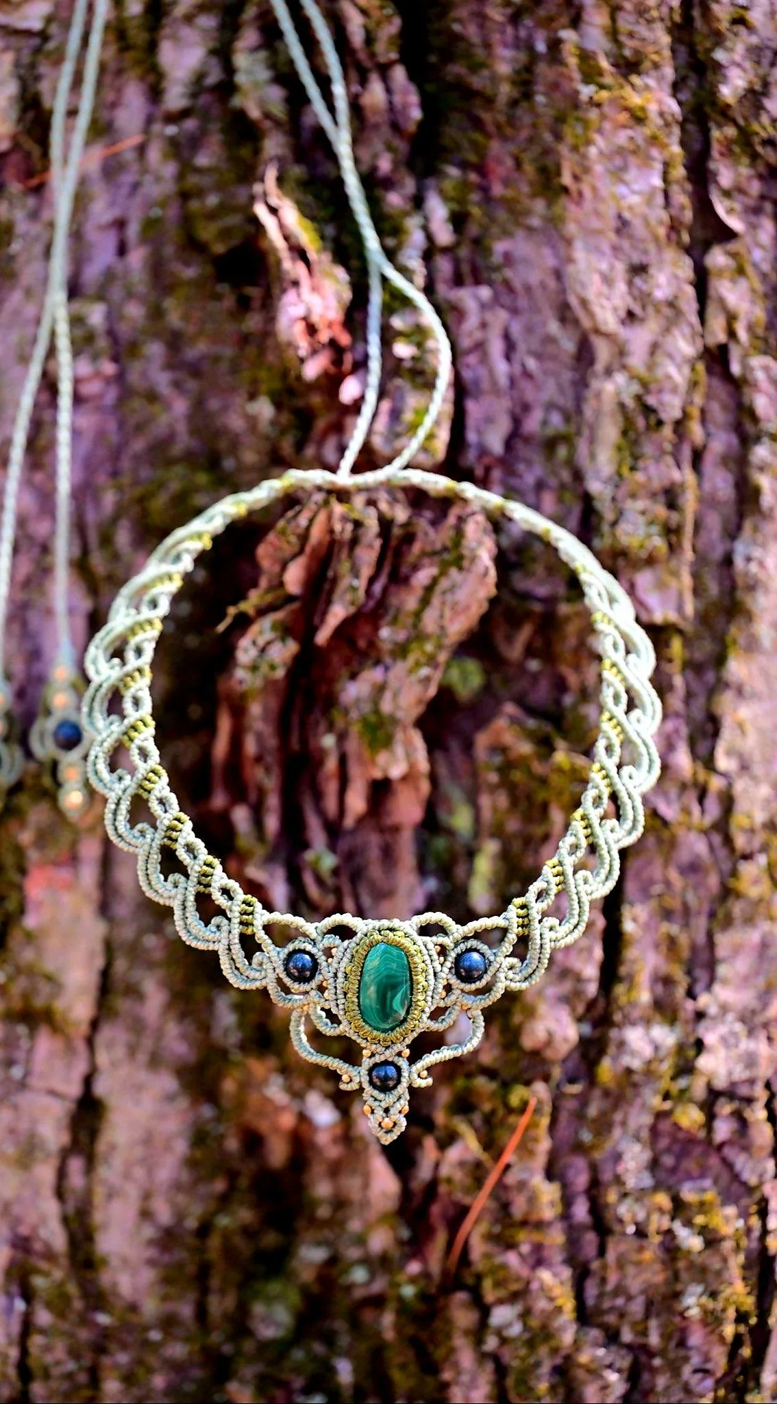 This is a really stunning necklace that features a Malachite cabochon that I paired with Moss Agate and Brass beads. This is a choker style necklace, so it’s meant to fit snug around your neck. It is 13 inches at its shortest and has extra long pullstrings with more Moss Agate and Brass beads. This piece looks like it belongs in the forest, or came from the jewelry box of a woodland creature, I love it, it could be yours!